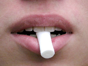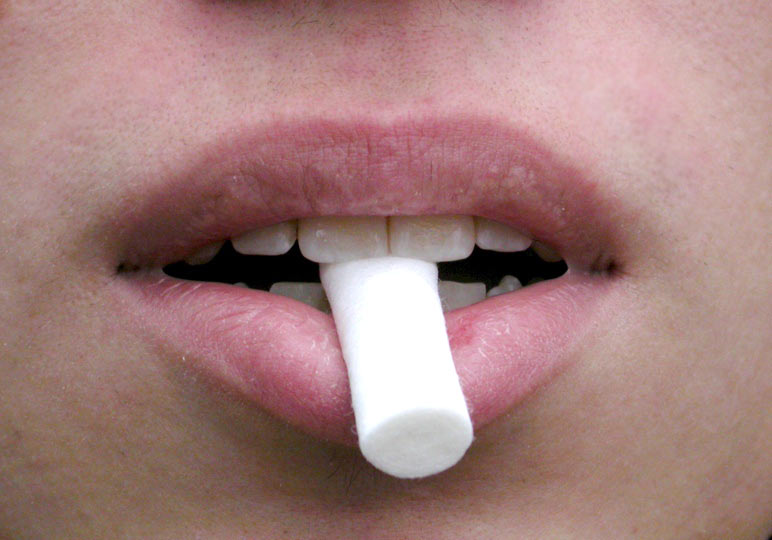 3. Afterwards place a cotton role between the upper and lower front teeth and walk around with it for about 5 minutes, changing walking direction several times.
